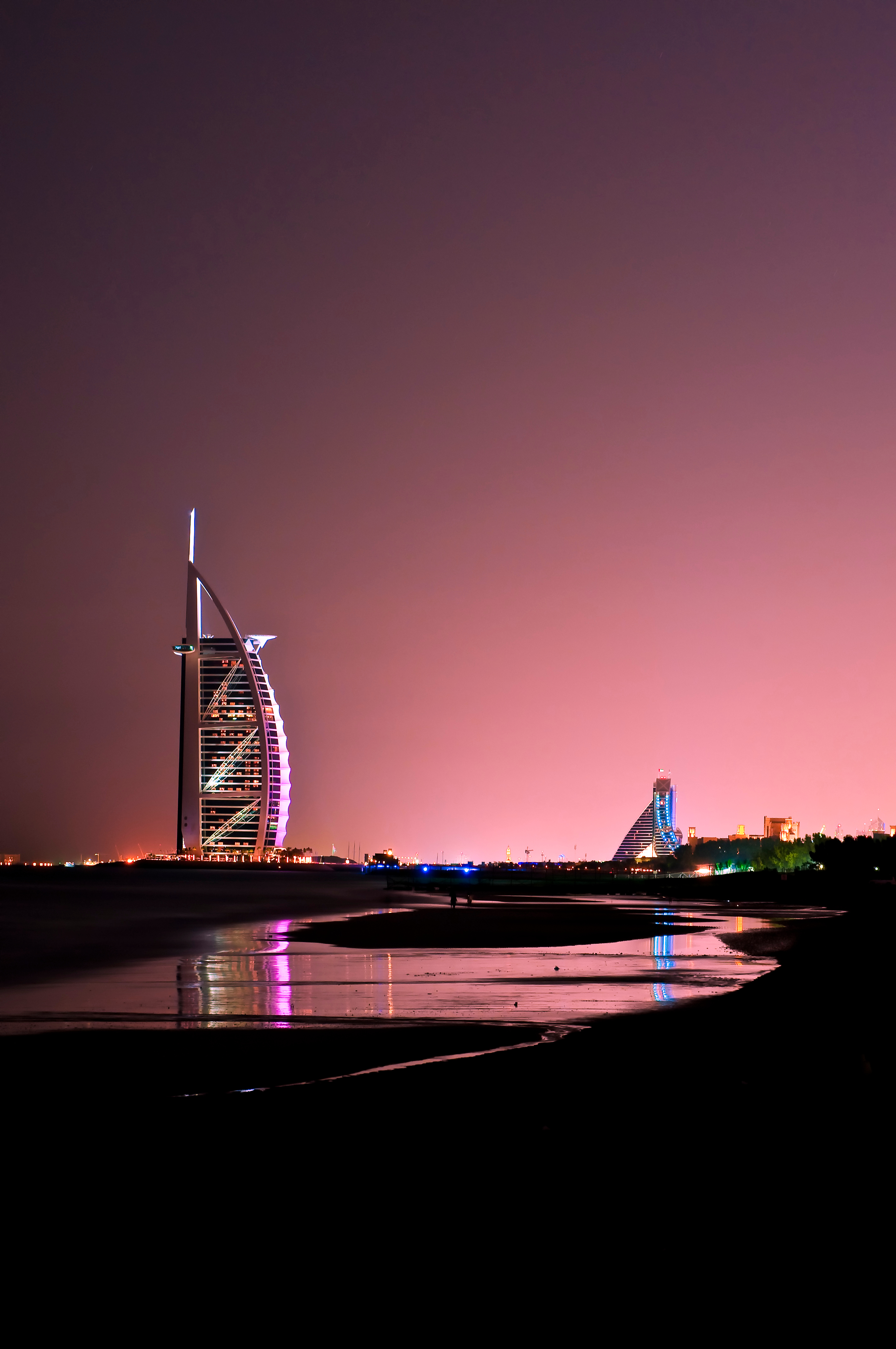 The iconic sail-shaped silhouette of the Burj Al Arab in Dubai is beautifully reflected on the tranquil waters of Jumeirah South Beach. The towering luxury hotel rises up from a man-made island, its striking design and shimmering exterior a true feat of engineering and architectural ingenuity. The Burj Al Arab dominates the skyline, its sail-like structure standing out against the clear sky. The setting sun casts a magenta glow on the sky over the Burj Al Arab, creating a stunning contrast against the darkening sky. The reflection of the hotel on the water is equally impressive, with the image of the building stretching out across the calm, glassy surface of the sea.